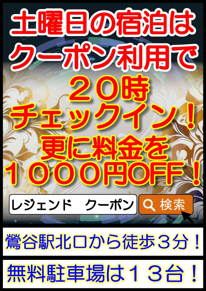 本日土曜日の宿泊はクーポン利用で20時からチェックインが可能です