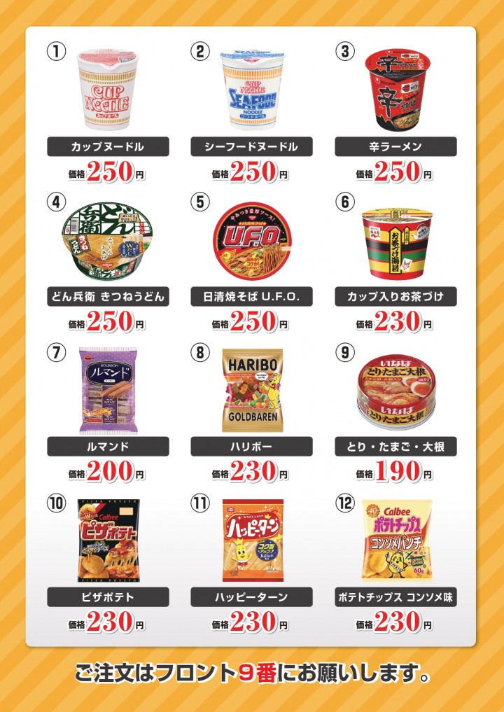 小腹がすいた時、お酒のおともに等 各種商品をご用意しております。